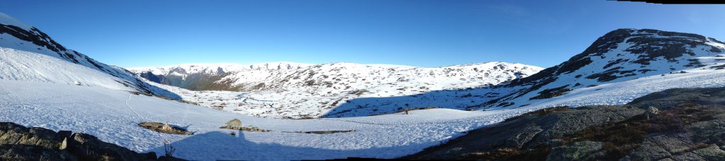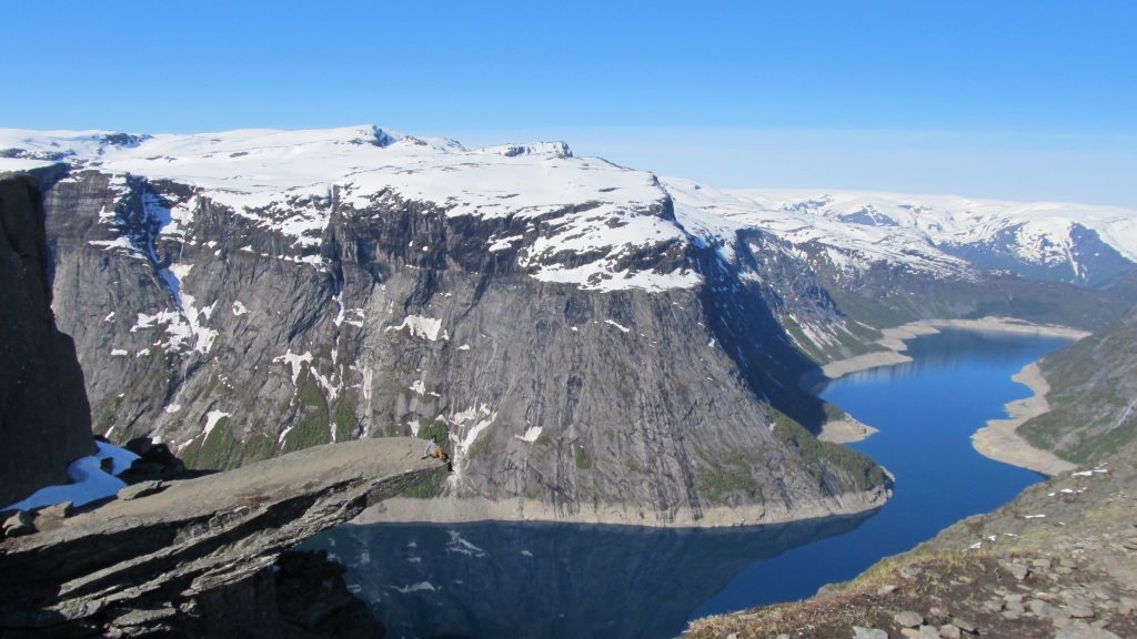 Wie schon beim Preikestolen schmerzten meine Beine bereits nach kurzer Zeit. Als ich nach einer gefühlten Ewigkeit die 2km-Marke erreichte, wollte ich beinahe schon umkehren – doch da meldete sich wieder mein Kampfgeist. Ich konnte nicht zurückkommen, ohne dort oben gestanden zu haben – also biss ich mich durch, nach einiger Zeit waren die Muskeln auch warm und es lief sich deutlich besser durch den tiefen Schnee. Es machte sich bezahlt, dass ich beim Gepäck aufs Gewicht geachtet hatte, außerdem gab es sowieso frisches Trinkwasser an jeder Ecke.
